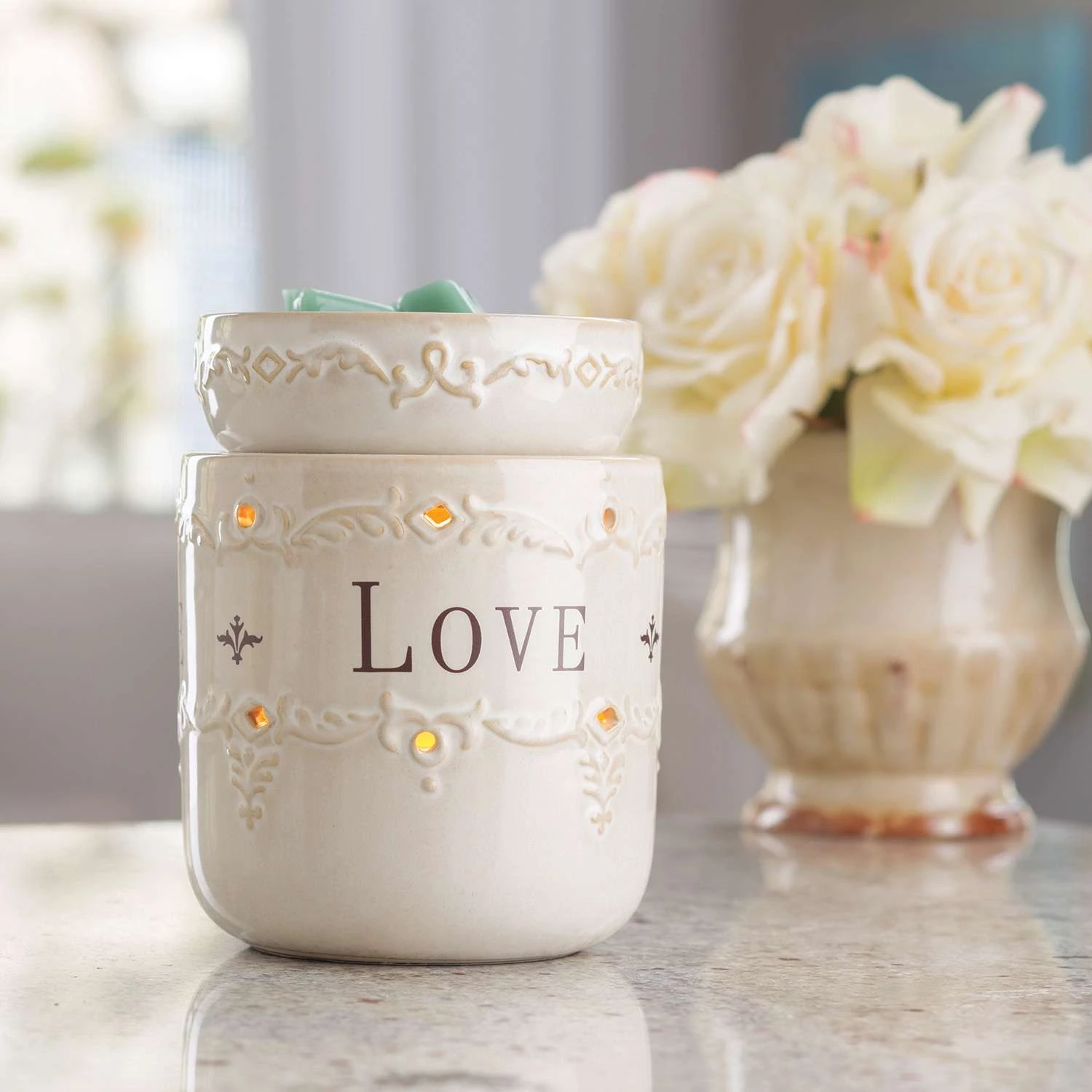 The message of “Live, Laugh, Love” on this ivory reactive glazed warmer keeps the important things in life in mind. Dish is removable and includes a warming bulb. Simply add wax melts to the dish, turn it on and enjoy your favorite fragrance as it spreads through the room. Illumination fragrance warmers use a halogen bulb to warm wax melts in the dish, releasing their fragrance 100% paraffin wax that holds more fragrance and lasts longer compared to scented gels, oils or sprays The soft glow of the bulb creates the ambiance and fragrance of a lit candle, without flame, soot or other pollutants Elegant home decor is the focus of every